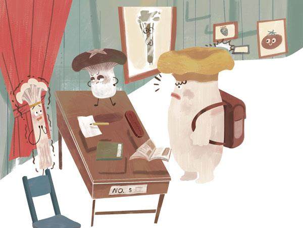 杏鲍菇“咣当”一下趴在聪聪的桌面上,看着聪聪的脸,故作真诚地说:“唉,看你这小细腿,没事,哥腿粗,哥背你走!”
