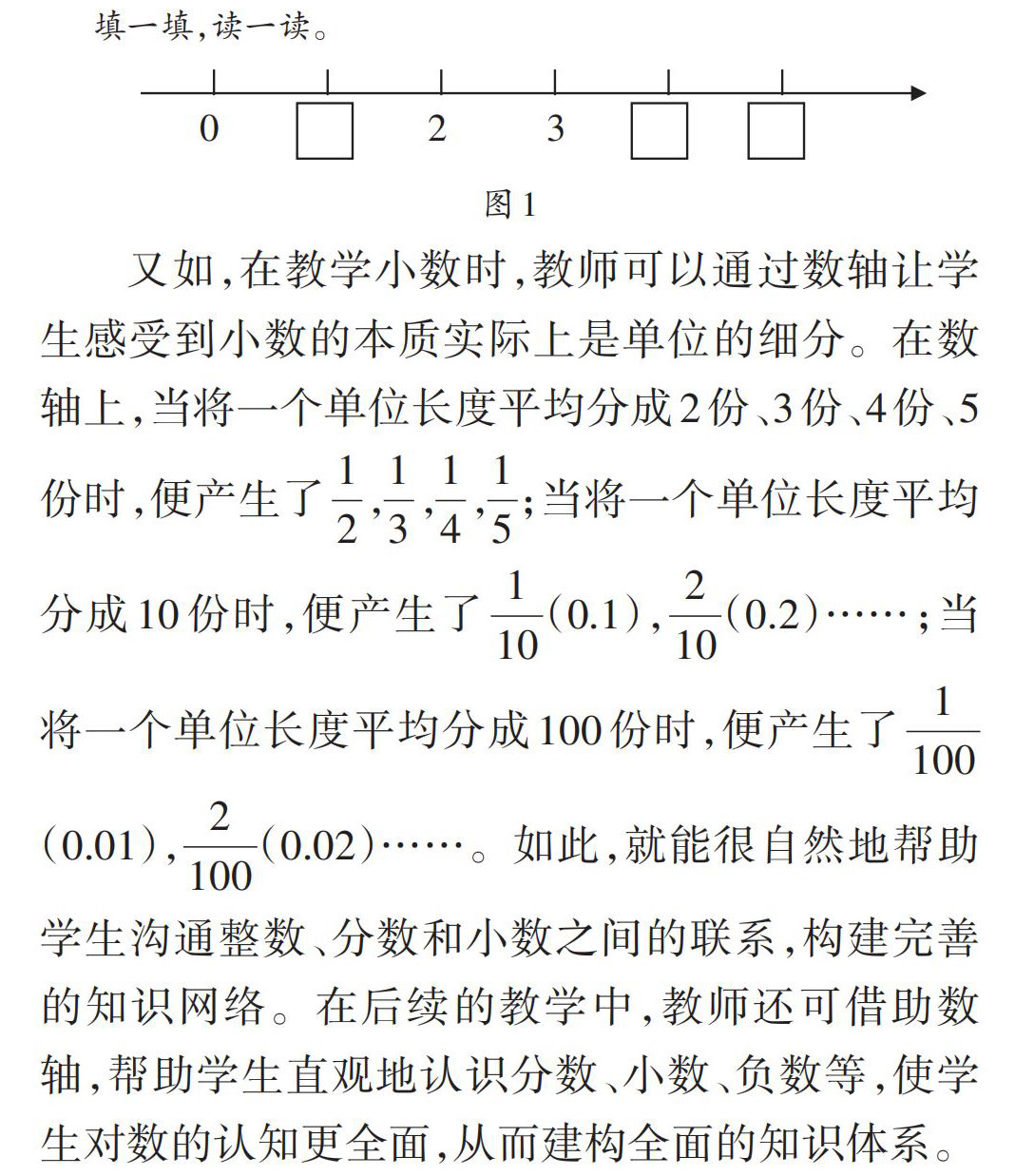 [摘 要]数轴在数学多个知识领域都可以见到它的影子,它对学生数感的培养、运算能力的提升、数学理解和思维发展都发挥着不可忽视的作用。在小学数学课堂中,教师灵活地运用数轴,有意识地向学生渗透数轴,可促进知识体系的建构,让学习真正发生。