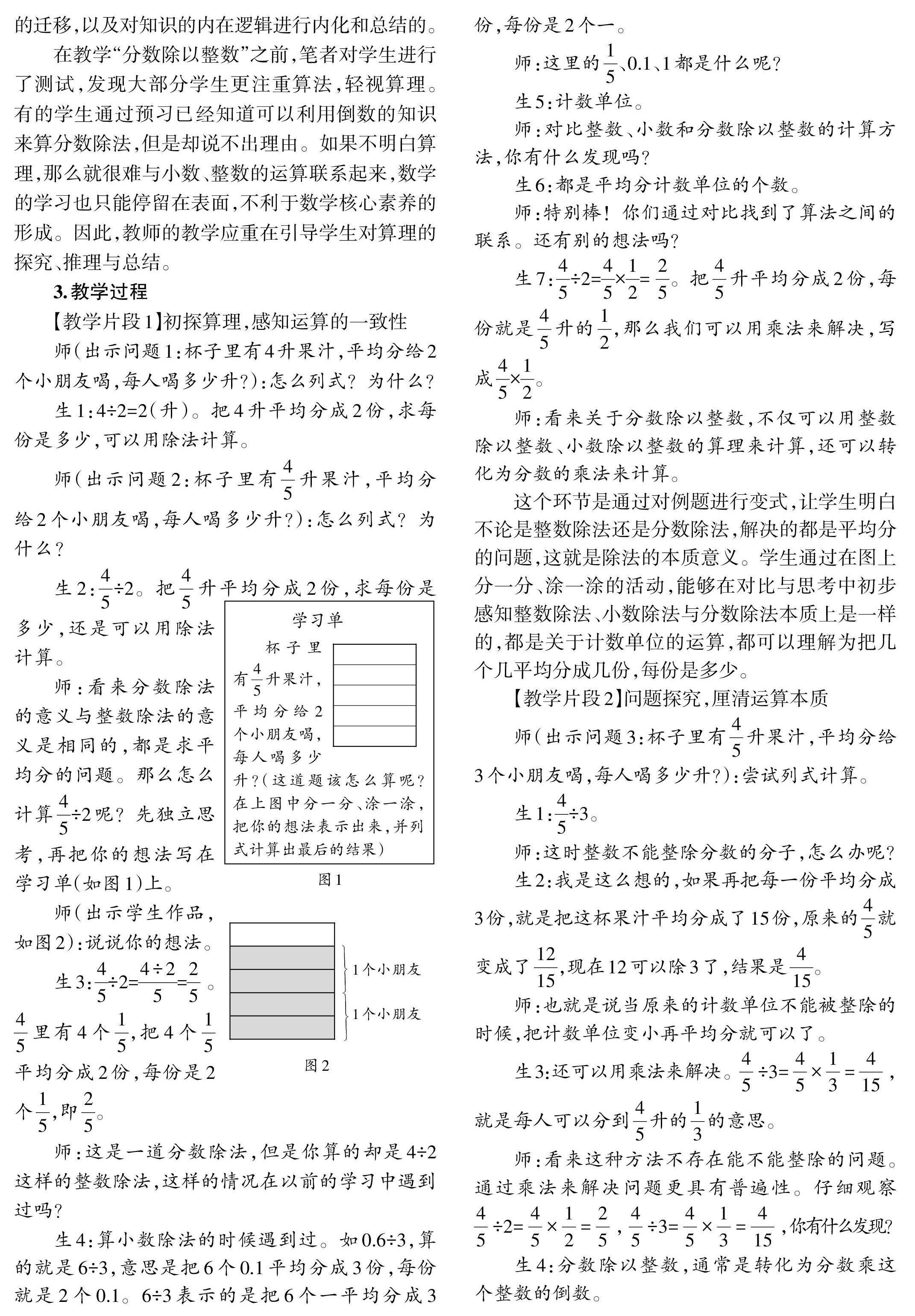 [摘 要]《义务教育课程方案和课程标准(2022年版)》中多次提出要感悟运算的一致性,强调运算的一致性不仅有利于学生整体把握学习内容的主线,主动架构知识框架,还有利于学生知识迁移、内化方法,自主提升运算素养。文章以“分数除以整数”的教学为例,探究感悟运算一致性的落实策略,即从算式到图形,数形结合感悟算理;从特殊到一般,激发认知冲突,厘清运算本质;从旧知到新知,对比内化打通算法。(剩余5082字)
