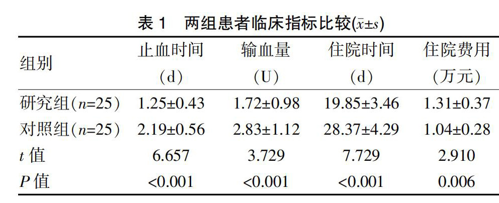 [摘要] 目的 分析肝硬化食管静脉曲张出血联合应用内镜套扎与生长抑素治疗的效果。方法 选取该院2017年1月—2021年1月收治的50例肝硬化食管静脉曲张出血患者,以随机数表法分为两组,对照组25例予以生长抑素治疗,研究组25例加用内镜套扎术治疗,比较两组治疗效果。结果 研究组止血时间和住院时间均明显较对照组短,研究组输血量少于对照组,住院费用高于对照组,差异有统计学意义(t=6.657、7.729、3.729、2.910,P<0.05)。(剩余8213字)