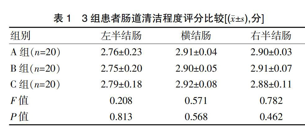 [摘要]目的 研究不同的二甲硅油服用时间对胶囊内镜肠道清洁的效果。方法 选择2017年8月—2020年8月期间该院收治的60例消化道疾病患者为研究对象,将随机数表法作为分组原则,随机分为3组,分别为A组(n=20)、B组(n=20)、C组(n=20),A组患者在服用洗肠液后立刻口服二甲硅油散;B组患者在肠镜检查前1 h口服二甲硅油散;C组患者在肠道准备干净后1 h口服二甲硅油散,比较3组患者肠道清洁程度评分(左半结肠、横结肠、右半结肠);肠道气泡程度评级(左半结肠、横结肠、右半结肠);不良反应评级;肠镜检查到达回盲部所用时间;耐受度。(剩余8316字)