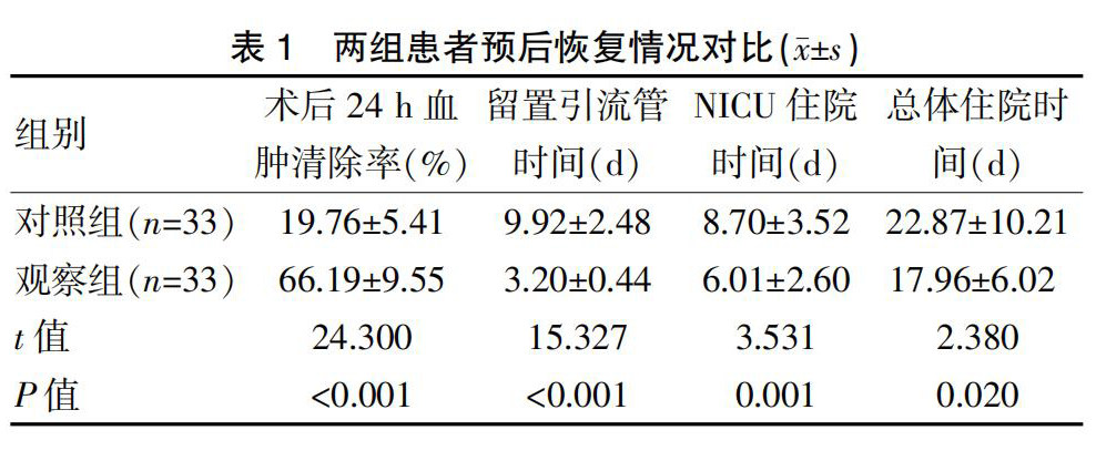 [摘要] 目的 分析在脑室内血肿伴铸型治疗中,采取术中超声引导神经内镜手术与脑室外引流术治疗干预的临床价值。方法 选择2018年1月—2020年12月该院收治的66例脑室内血肿伴铸型患者为研究对象,采取随机数表法,将其均分为两组,观察组(33例)接受术中超声引导神经内镜手术治疗,对照组(33例)接受传统脑室外引流术治疗;对比两组患者的预后效果、格拉斯哥昏迷指数(GCS)评分、并发症发生率、日常生活能力(Barthel指数)评分、生活质量(SF-36)评分。(剩余8673字)