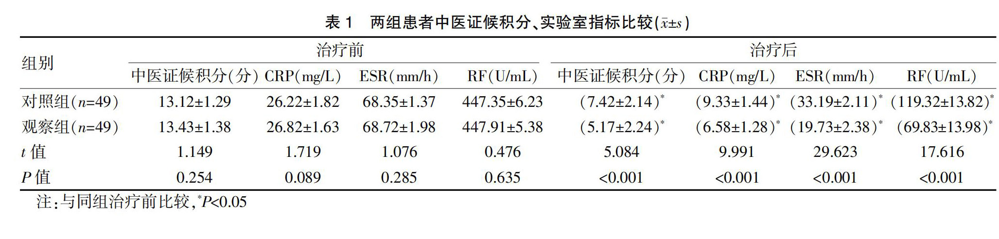 [摘要] 目的 探讨芎附痛痹汤联合熏蒸治疗类风湿性关节炎的临床疗效。方法 选择该院2019年1月—2021年1月收治的类风湿性关节炎患者98例,以数字随机的方式分为观察组、对照组,每组49例。对照组采用芎附痛痹汤进行治疗,观察组采用芎附痛痹汤联合熏蒸治疗。比较两组中医证候积分、实验室指标(CRP、ESR、RF),临床指标变化(功能障碍指数、关节疼痛指数、20 m步行时间),以及治疗效果。(剩余8341字)