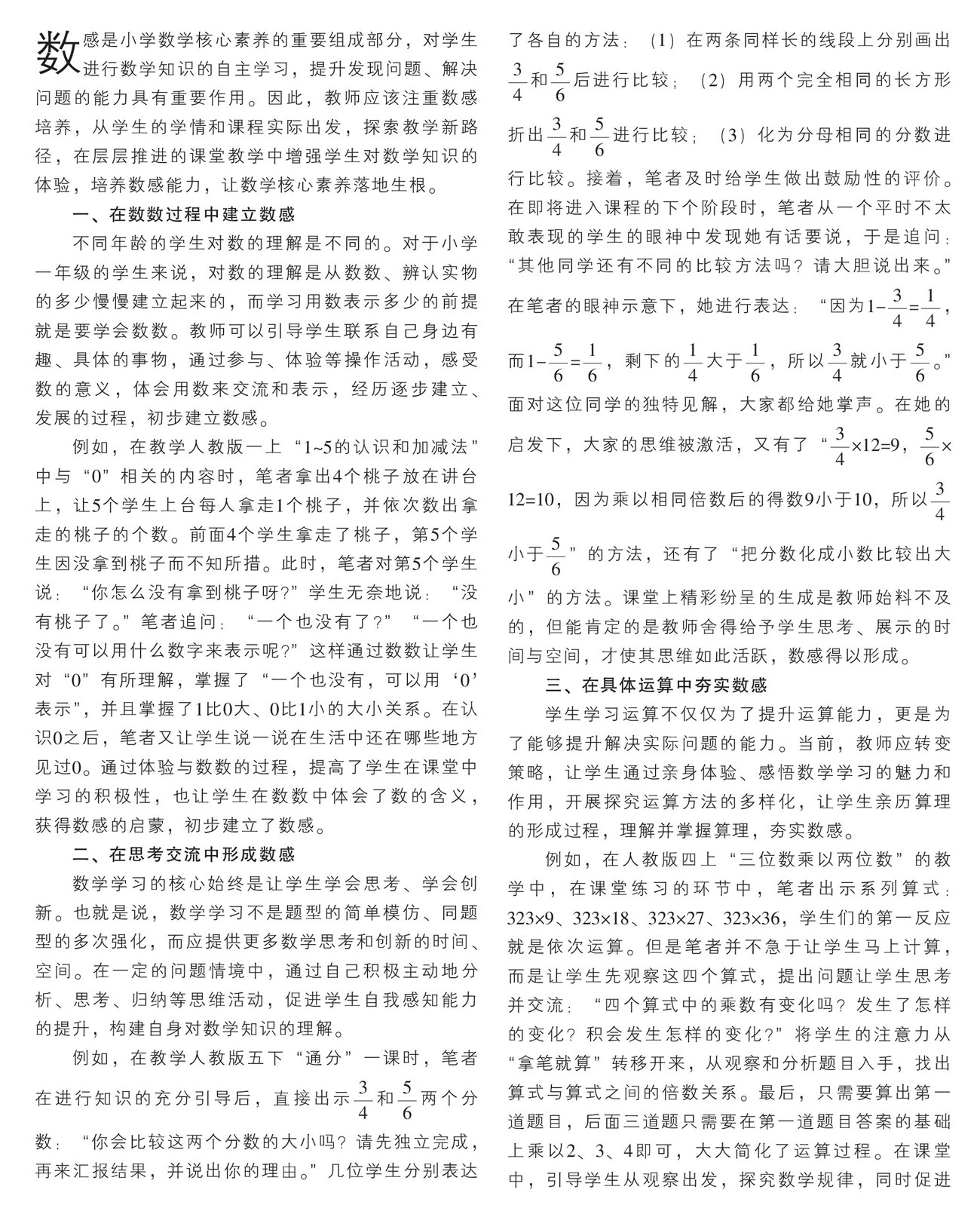 数感是小学数学核心素养的重要组成部分,对学生进行数学知识的自主学习,提升发现问题、解决问题的能力具有重要作用。因此,教师应该注重数感培养,从学生的学情和课程实际出发,探索教学新路径,在层层推进的课堂教学中增强学生对数学知识的体验,培养数感能力,让数学核心素养落地生根。