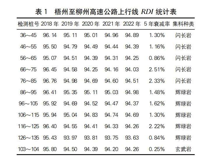 摘要:文章基于对2018—2022年梧州至柳州高速公路应用闪长岩集料的路段各项耐久性指标的跟踪检测,分析总结各项指标通车五年来的变化情况,并与使用辉绿岩、玄武岩集料的相邻路段进行对比验证,探讨闪长岩集料应用于沥青路面表面层的耐久性。