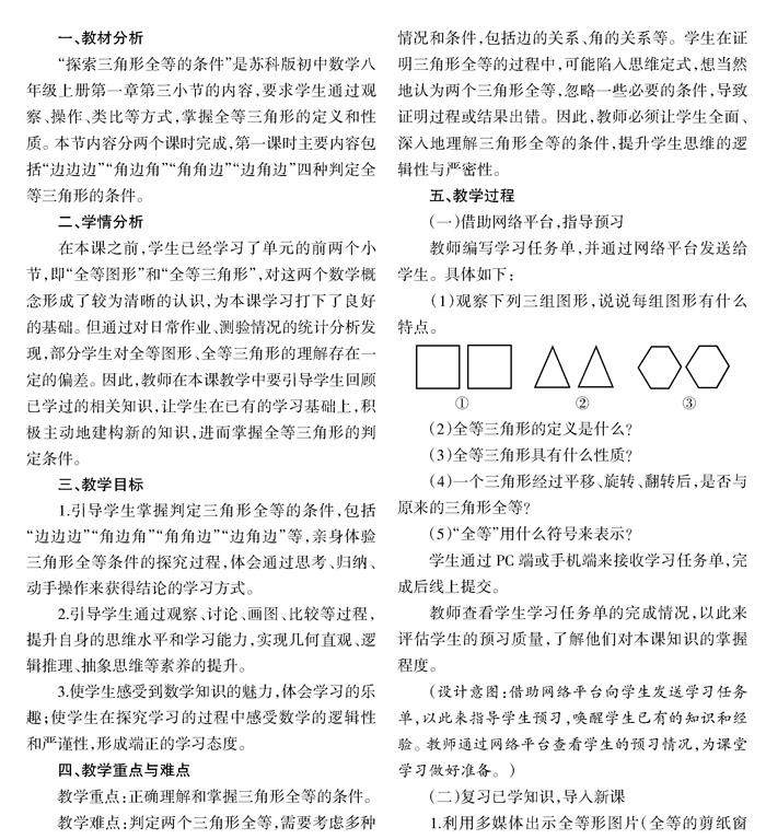 “探索三角形全等的条件”是苏科版初中数学八年级上册第一章第三小节的内容,要求学生通过观察、操作、类比等方式,掌握全等三角形的定义和性质。本节内容分两个课时完成,第一课时主要内容包括“边边边”“角边角”“角角边”“边角边”四种判定全等三角形的条件。