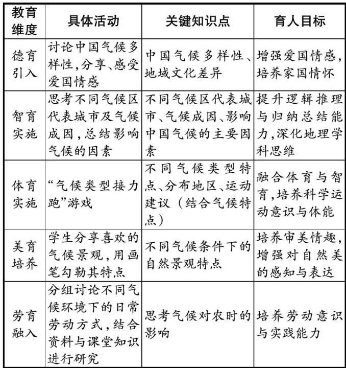 从“德育"融入中让学生感受家国情怀和美好自然,提升对祖国的热爱之情,增强民族自豪感、树立正确的人地关系理念;从“智育"的实施中带领学生更好地掌握人地协调发展的相关知识,拥有较强的地理思维;在"体育"元素的影响中为学生提供一个轻松、愉悦的活动空间;在“美育”的熏陶下近距离感受各种自然之美;在"劳育"中提高学生的实践水平,让学生在更加积极、向上的力量中得到全面发展。(剩余4949字)