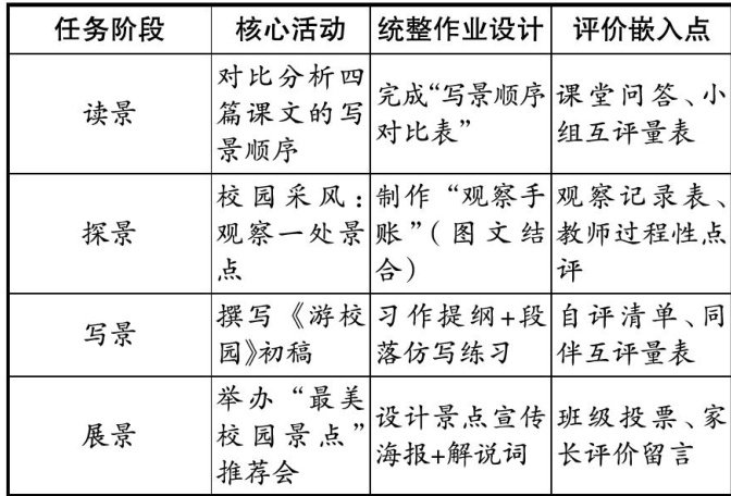 单元统整作业设计是以单元整体教学目标为核心,通过系统化、结构化的作业任务设计,整合单元内的知识、能力与素养目标,实现“教一学一评”一体化。它的核心是打破单篇教学的割裂性,强调整体性、递进性和实践性。四年级下册第五单元的主题为“妙笔写美景,巧手著奇观”。它紧扣写景习作,从《海上日出》按太阳变化顺序、《记金华的双龙洞》按游览顺序,以及习作例文《颐和园》《七月的天山》按游览顺序描绘景物,到“习作"要求写清楚游览顺序与景物特点,各板块紧密围绕“了解课文按一定顺序写景物的方法;学习按游览的顺序写景物"这一语文要素,为单元统整提供内容连贯性与逻辑性基础。(剩余5597字)