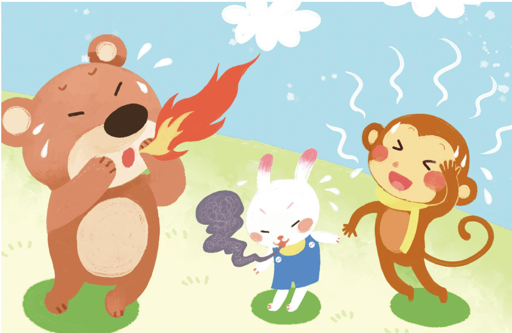 “找呀找呀找朋友,找到一个好朋友,敬个礼呀握握手,你是我的好朋友…”小弼猴皮皮、笨笨熊和乖乖兔在校园里又唱又跳的。瞧,他们头上都开始流汗了。
