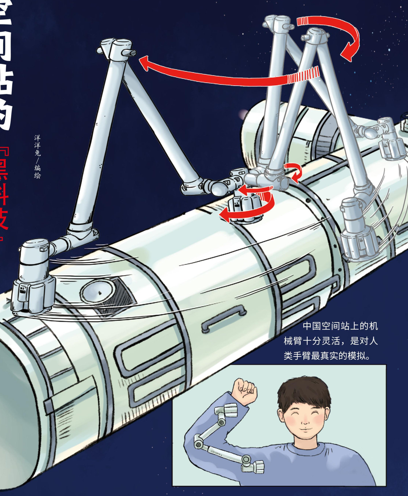 机械臂一定要很长才能“抓”到远处的东西吗?答案是不一定!中国空间站上安装的机械臂可以在空间站的外壁上自由“爬行”,只要“爬”到目标附近,就可以进行各种操作。