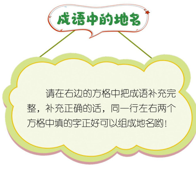 请在右边的方格中把成语补充完整,补充正确的话,同一行左右两个方格中填的字正好可以组成地名哟!