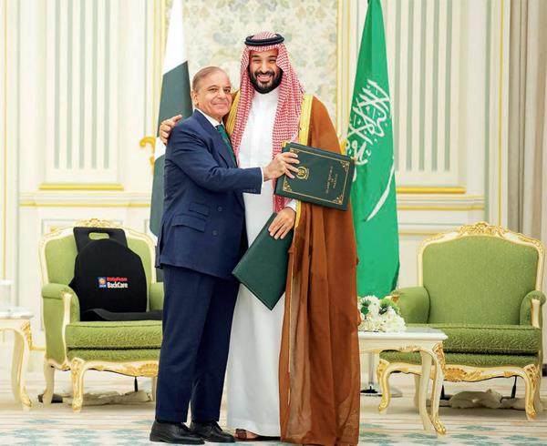 9月17日,沙特阿拉伯王储兼首相穆罕默德·本·萨勒曼(右)在沙特首都利雅得与到访的巴基斯坦总理夏巴兹·谢里夫合影。 沙特阿拉伯和巴基斯坦政府17日在沙特签署共同战略防御协议。