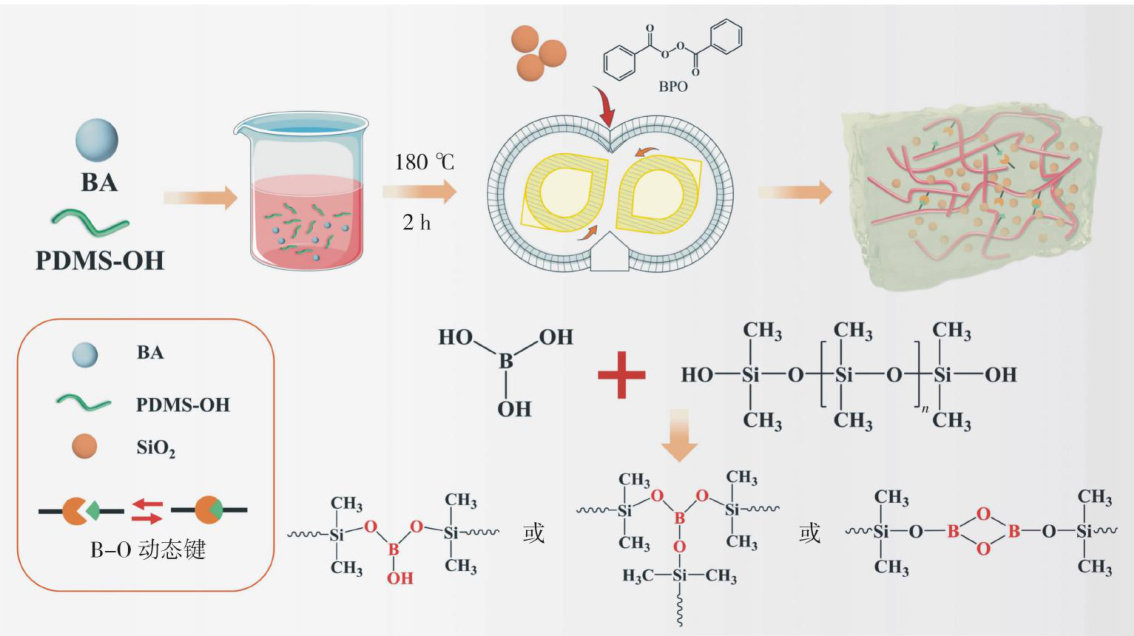 Abstract:Polyborosiloxane(PBS) exhibits unique shear-thickening behavior due to the dynamic crosslinking characteristics of B-O bonds in its molecular structure,offering significant potential in the field of human safety protection. PBS was synthesized using boric acid (BA)and hydroxyl-terminated polydimethylsiloxane(PDMS-OH) as raw materials. Fumed silica (F-SiO2 )and precipitated silica (2 (P-SiO2 )were employed as reinforcing fillers to enhance the rheological properties and impact resistance of PBS,and their reinforcement mechanisms were analyzed. The results indicate that compared to P-SiO2 , F-SiO2 demonstrates a more pronounced reinforcing effect. When the mass fraction of F-SiO2 added is 6% ,PBS exhibits the best performance and can increase the maximum storage modulus by 374% .The mechanism by which fumed silica enhances the rheological properties and impact resistance of PBS is that under high strain rates,fumed silica aggregates to form particle clusters,limiting the movement of PBS molecular chains and thereby enhancing the modulus of the material. The research findings can provide reference for the development of PBS protective materials.