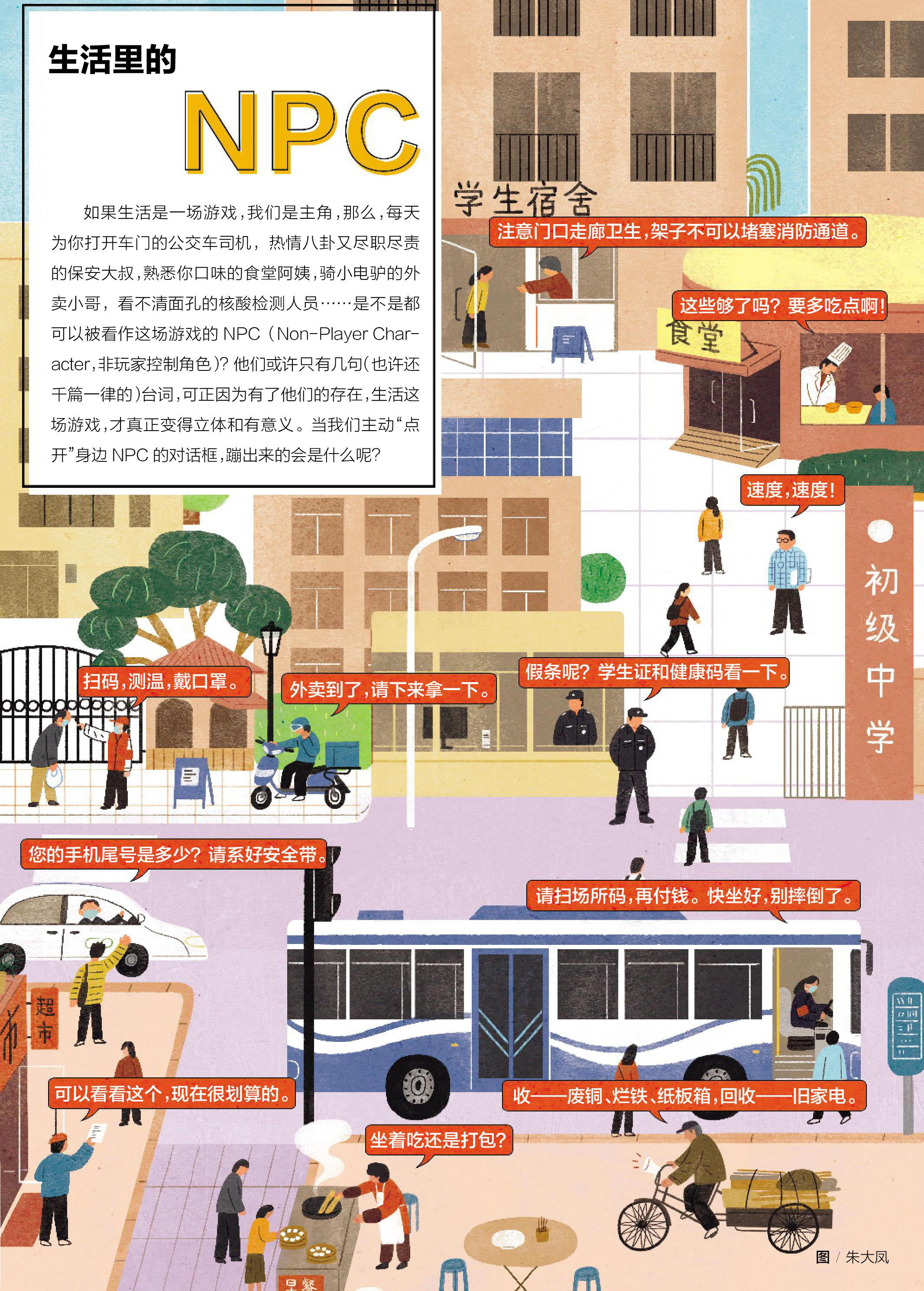 如果生活是一场游戏,我们是主角,那么,每天为你打开车门的公交车司机,热情八卦又尽职尽责的保安大叔,熟悉你口味的食堂阿姨,骑小电驴的外卖小哥,看不清面孔的核酸检测人员……是不是都可以被看作这场游戏的NPC(Non-Player Character,非玩家控制角色)?他们或许只有几句(也许还千篇一律的)台词,可正因为有了他们的存在,生活这场游戏,才真正变得立体和有意义。(剩余27字)