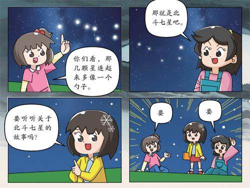 北斗七星由天枢、天璇、天玑、天权、玉衡、开阳、摇 光7颗星组成,因为7颗星的连线很像古代舀酒的斗而得名。古 代人常以神话来解读天上的星星。成书于战国时期的天文学专 著《甘石星经》写道:“北斗星谓之七政,天之诸侯,亦为帝 车。”西汉《史记·天官书》中也提到“斗为帝车,运于中 央,临制四乡”。(剩余681字)