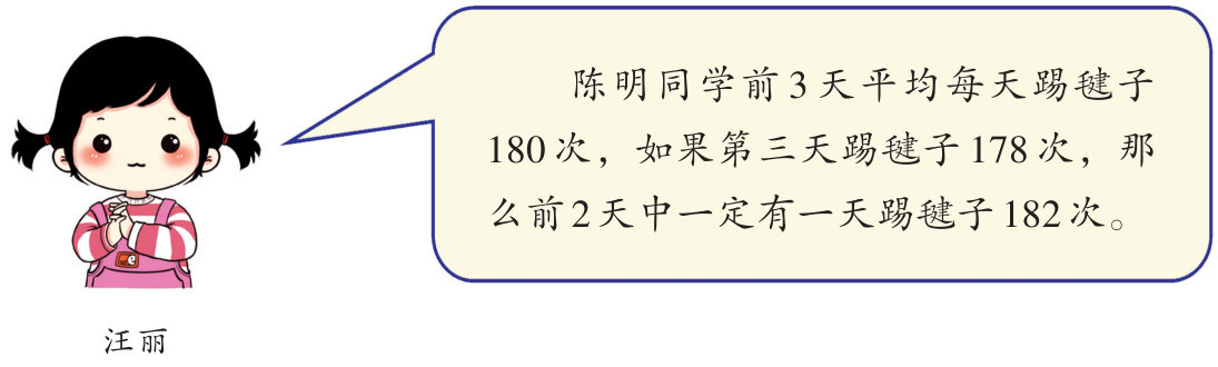 “我认为汪丽同学的说法不对。陈明同学第三天踢毽子178 次,比平均每天踢的180次少了2次,这2次可以用前2天每天多踢1次来移多补少’,也可以用前2 天中的一天多踢几次来为另2 天‘移多补少’。(剩余892字)