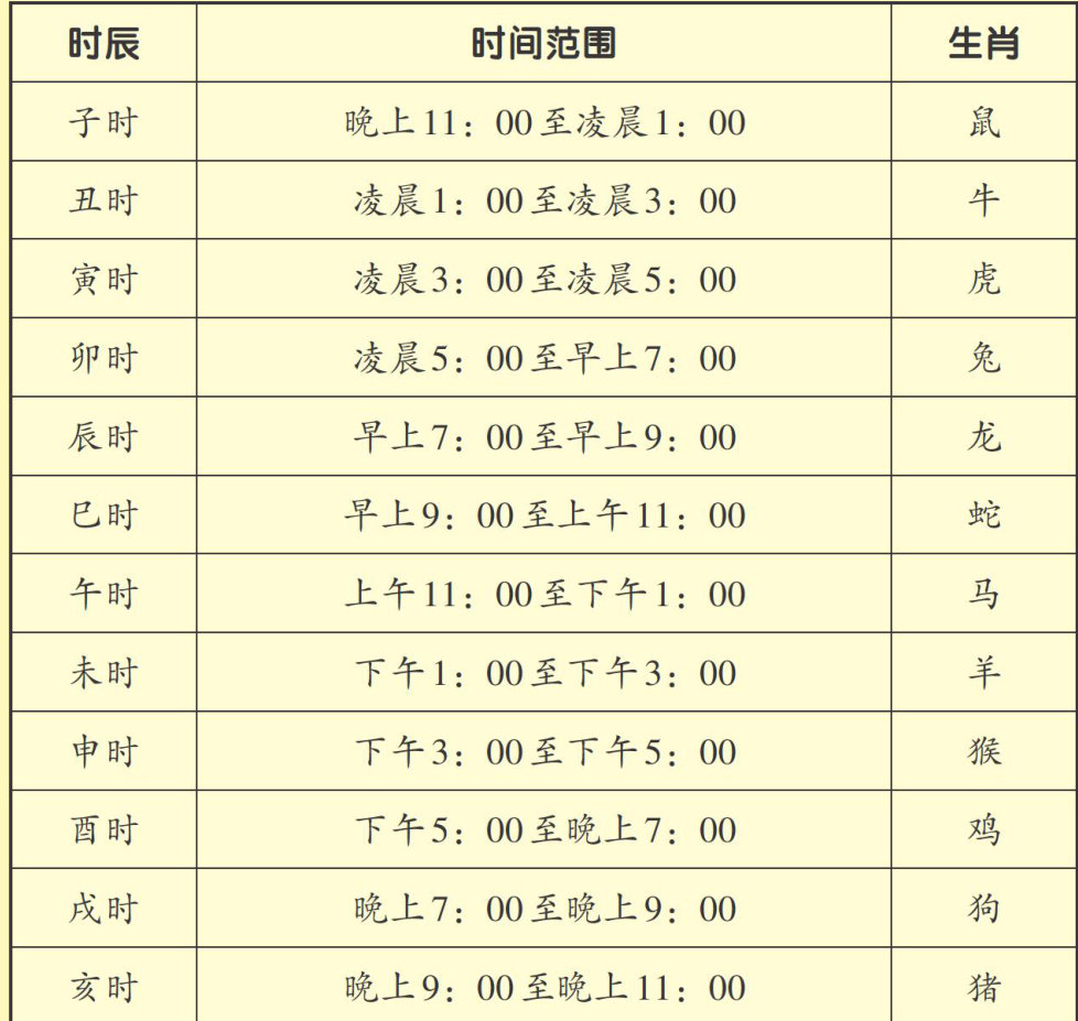 大家知道,现在一天(一昼夜)是用24小时来计时的。古人却不是,他们是根据太阳升降的自然规律、天色的变化以及自己日常的生产活动、生活习惯,把一天划分为十二个时辰,分别是子、丑、寅、卯、辰、巳、午、未、申、酉、戌、亥;同时,又根据十二个时辰的时间和动物出没时间的规律,把十二个时辰分别与大家熟悉