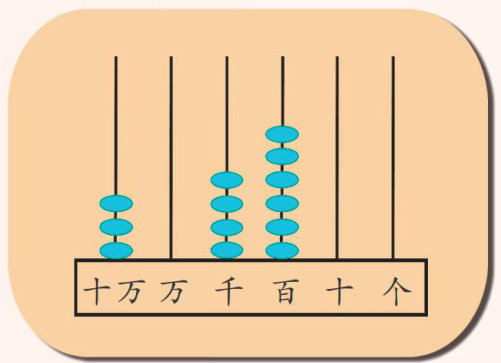 数学上表示数最直观的方法是用计数器来表示。计数器上标有计数单位,所以要表示304600这个数,依次在计数器上的十万位上拨3颗珠子表示3个十万、千位上拨4颗珠子表示4个千、百位上拨6颗珠子表示6个百,其余计数单位上没有数就不用拨珠,空着即可(如图所示),这样我们就用计数器把304600表示出来了。(剩余647字)