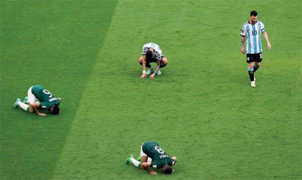 11月22日,卡塔尔卢赛尔球场,2022卡塔尔世界杯足球赛C组比赛中,阿根廷队以1比2不敌沙特阿拉伯队。赛后,沙特阿拉伯队的球员(绿衣者)庆祝胜利,而阿根廷队的梅西(右一)正在离开球场。图/视觉中国