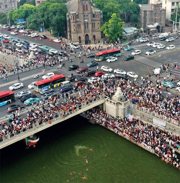 9月3日,天津狮子林桥,大量群众围观当地的跳水场面。