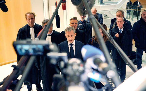 9月25日,法国巴黎,法国前总统萨科齐(中)在庭审后接受媒体采访。图/视觉中国