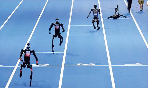2025年8月17日,人形机器人在2025世界人形机器人运动会上参加比赛。图/中新