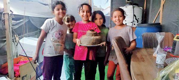 10月9日,加沙城西部,拉莎的孩子们用沙子制作了一个蛋糕,庆祝以色列与哈马斯停火。图/受访者提供