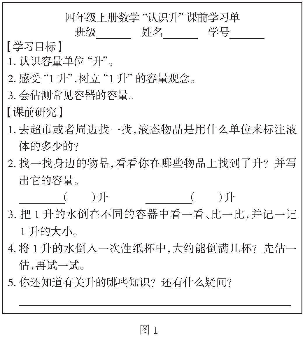 【摘 要】量感是2022年版数学课程标准新提出的核心素养,计量单位的学习就是培养学生量感的重要途径。开展计量单位项目化学习,可以更好地发展学生的量感。笔者结合“升和毫升”单元,首先阐述学生产生错误的原因及运用项目化学习的优势;接着结合本单元,分别从课前以学习单为主引领渗透知识、课中以学生为主多元体验知识、课后以实践为主内化知识来阐述计量单位项目化学习的一般步骤。(剩余3820字)