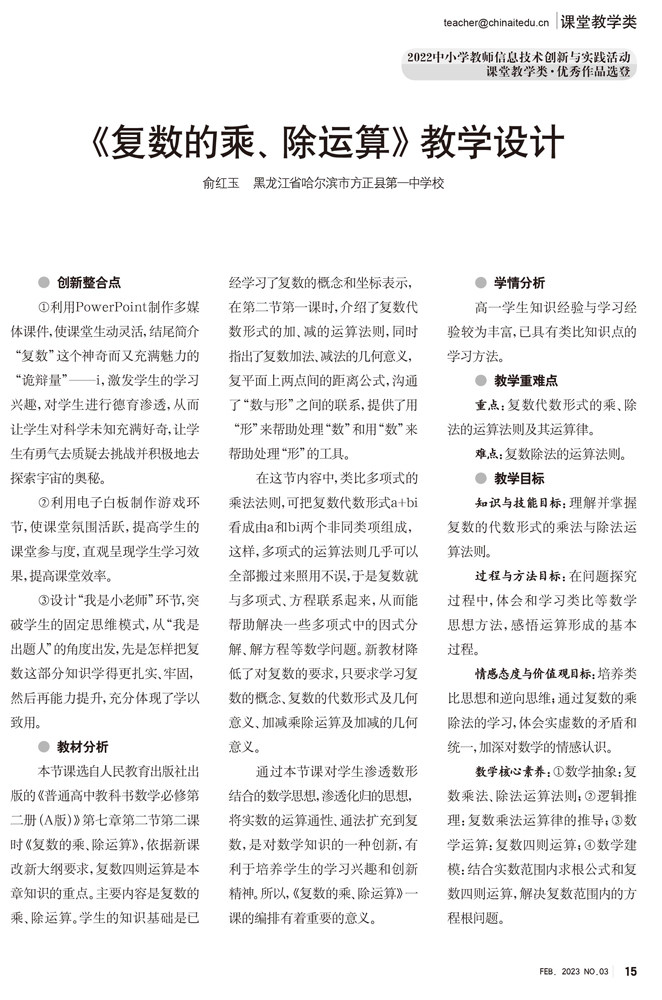 ①利用PowerPoint制作多媒体课件,使课堂生动灵活,结尾简介“复数”这个神奇而又充满魅力的“诡辩量”—i,激发学生的学习兴趣,对学生进行德育渗透,从而让学生对科学未知充满好奇,让学生有勇气去质疑去挑战并积极地去探索宇宙的奥秘。
