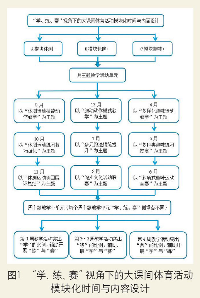 浙江省嘉兴市实验小学科技城校区立足校本实践,依据“国家体测布局、地方体改规划、学校体教安排”三级时空序位的设计逻辑,逐渐探索出了以“学、练、赛”为活动基调、以“主导+辅助”为内容设计、以“团队+个体”为组织路径的大课间体育活动模块化体系。