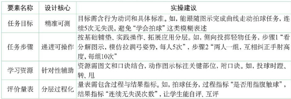 学习任务单是将学习内容转化为具体任务的教学工具,借助清晰的任务描述、步骤指引和资源支持,引导学生有计划地完成学习活动。但在实际运用中,学习任务单“流于形式”“与素养培育脱节”等问题屡见不鲜。“草根争鸣”栏目就此展开话题研讨,各地一线体育教师积极分享,形成了多维度实践经验,现从设计、运用、反馈三方面进行系统梳理和总结。(剩余3641字)