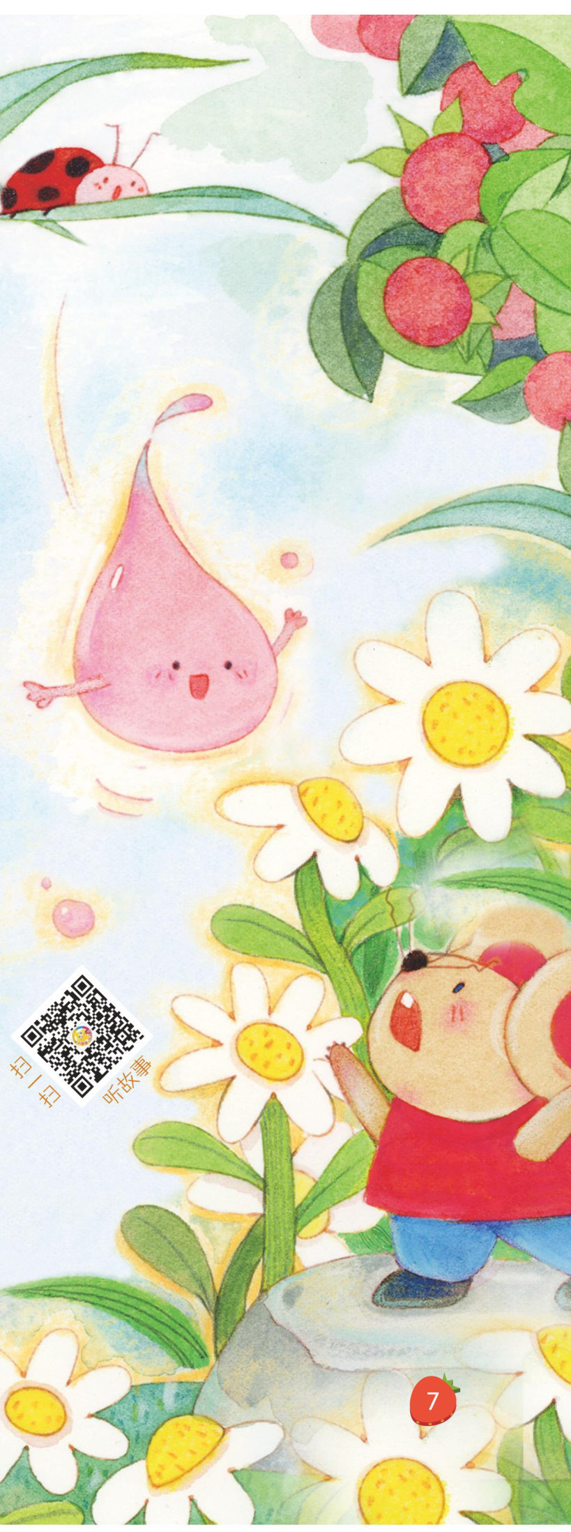 qingchén yiké xiao shuidi cóng xiang shu yé shang gun xiàlái kanjianshen biān 清晨,一颗小水滴从橡树叶上滚下来。看见身边depiao chóngchuan zhe huayi shang chujudāi zhe huáng maozi tānán guo de shuo的瓢虫穿着花衣裳,雏菊戴着黄帽子,它难过地说: wei shén me w méi you yan séne “为什么我没有颜色呢?”