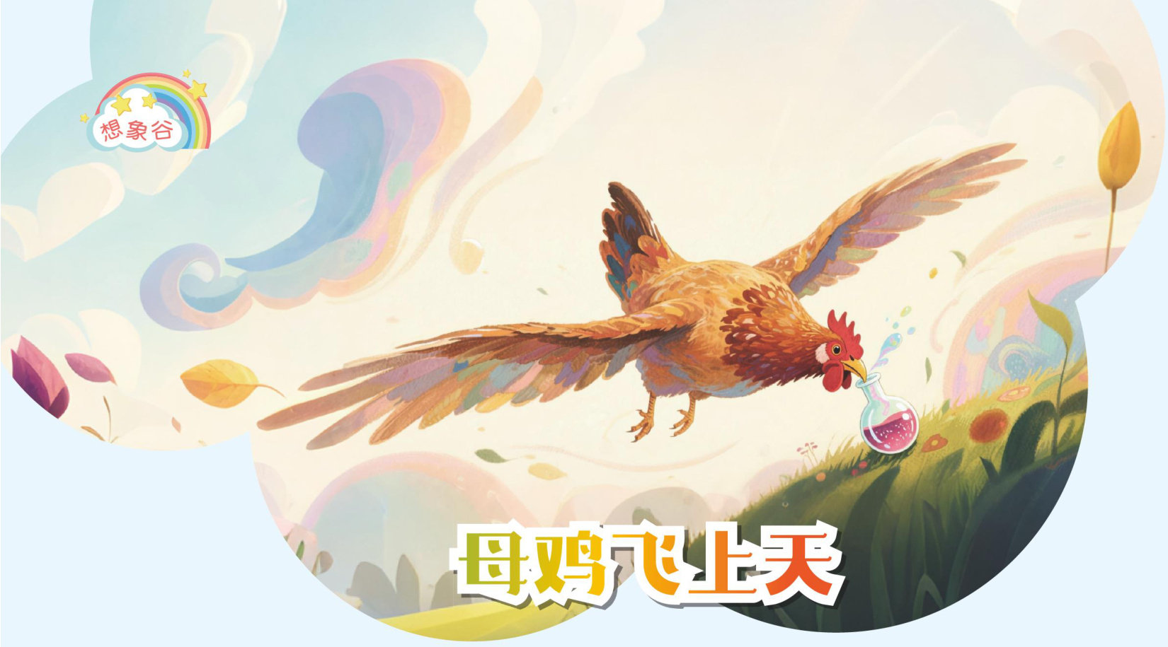 “终于成功了!”母鸡花花喝下自己秘密研发的魔法药水。不一会儿,它的翅膀变得又宽又长,扑腾几下,居然像风筝似的飘到了半空。