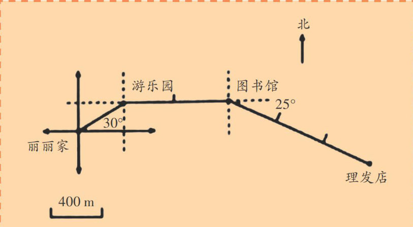 如下图所示,游乐园在丽丽家北偏东 30∘ 方向,理发店在图书馆南偏东 25∘ 方向,图书馆到理发店的距离是 1200m 。(剩余114字)