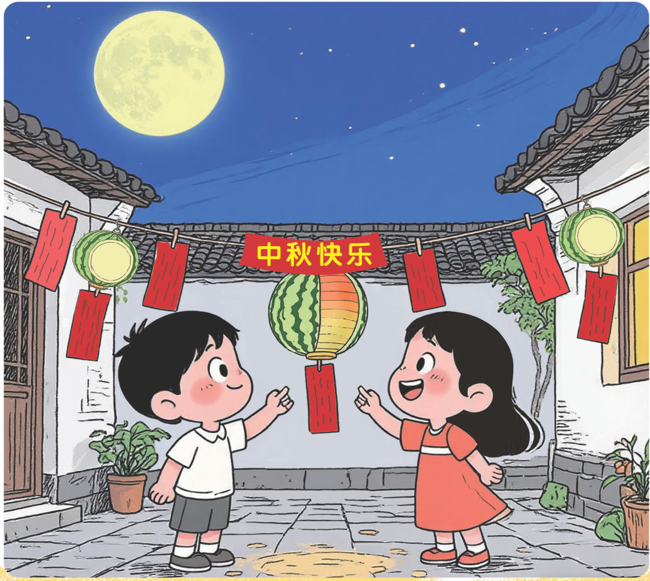 这幅图非常简洁,同学们只要联系自己的生活实际,再er展开合理的想象,前面的三个问题就能迎刃而解。左上角的圆月及绳上的字,已经告诉我们故事发生的具体时间了。从标题“猜灯谜”就能知道两个小朋友在干什么。(剩余155字)