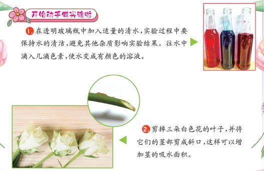 注意:不同种类的花朵对色素的吸收速度不同,可以用多种花朵多做几次实验,然后对比实验结果。(剩余292字)