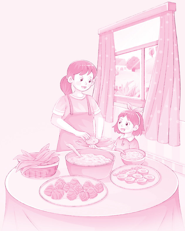 妈妈一边讲解,一边演示怎么包粽子:把两三片箬叶叠在一起,折成圆锥形。我学着妈妈的样子,将箬叶叠在一起,折成圆锥形,兴奋地说:“这个步骤真简单!”妈妈笑了笑,说:“接下来就不简单喽。”妈妈继续给我示范:先在箬叶里均匀地铺一层糯米,接着铺一层绿豆,再放一块五花肉,然后铺一层绿豆,最后又铺上一层糯米。(剩余713字)