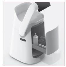 这款座椅型机器人的机械臂末端有一个平板电脑。坐下来后,你可以自由调节平板电脑的使用角度和高度,再用它查询信息或者办公。座椅下方设有抽屉式存储空间,可安全存放、运送物品,其内部配备的紫外线消毒装置能对存储的物品进行消毒,确保卫生。