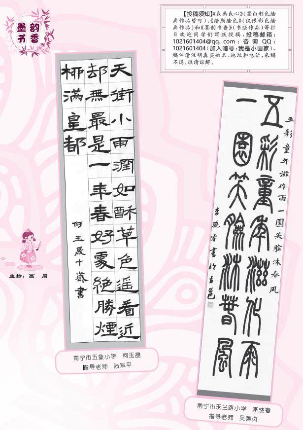 【投稿须知】《我画我心》(黑白彩色绘画作品皆可)、《绘颜绘色》(仅限彩色绘画作品)和《墨韵书香》(书法作品)等栏目欢迎同学们踊跃投稿,投稿邮箱:1021601404@qq.com;咨询QQ:1021601404(加入暗号:我是小画家)。稿件请注明真实姓名、地址和电话,来稿不退,敬请谅解。