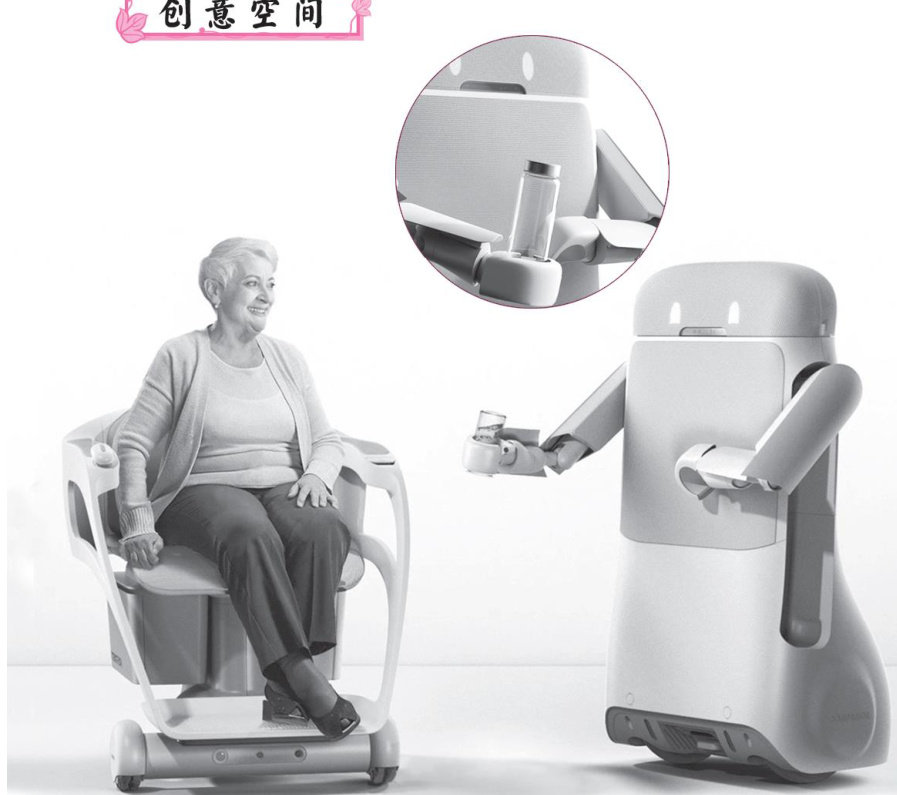 这款机器人轮椅由一个电动轮椅和一个服务机器人组成,能为老年人提供更加人性化的护理体验:电动轮椅有充足的存储空间,便于存放药品、生活用品等;服务机器人不仅能根据指令抓取物品并递给用户,还能按照用户的指令把电动轮椅推到指定地点。