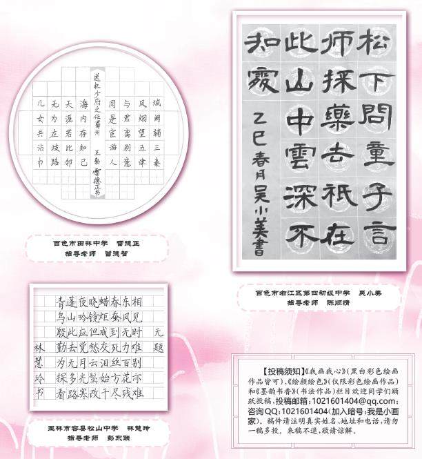 【投稿须知】《我画我心》(黑白彩色绘画作品皆可)、《绘颜绘色》(仅限彩色绘画作品)和《墨韵书香》(书法作品)栏目欢迎同学们踊跃投稿,投稿邮箱:1021601404@qq.com;咨询QQ:1021601404(加入暗号:我是小画家)。稿件请注明真实姓名、地址和电话,请勿一稿多投。来稿不退,敬请谅解。(剩余0字)