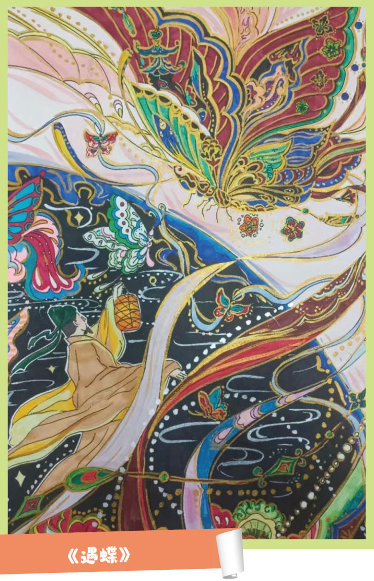 作品简介:蝴蝶的“蝴”和福气的“福”谐音,象征着福禄吉祥,所以在我国传统诗文画作中经常出现蝴蝶的元素。这幅作品的灵感来自典故“庄周梦蝶”,小作者“在梦与现实的交界”,遇见了美丽的蝴蝶,遇见了奇幻的世界,也遇见了古人的浪漫。
