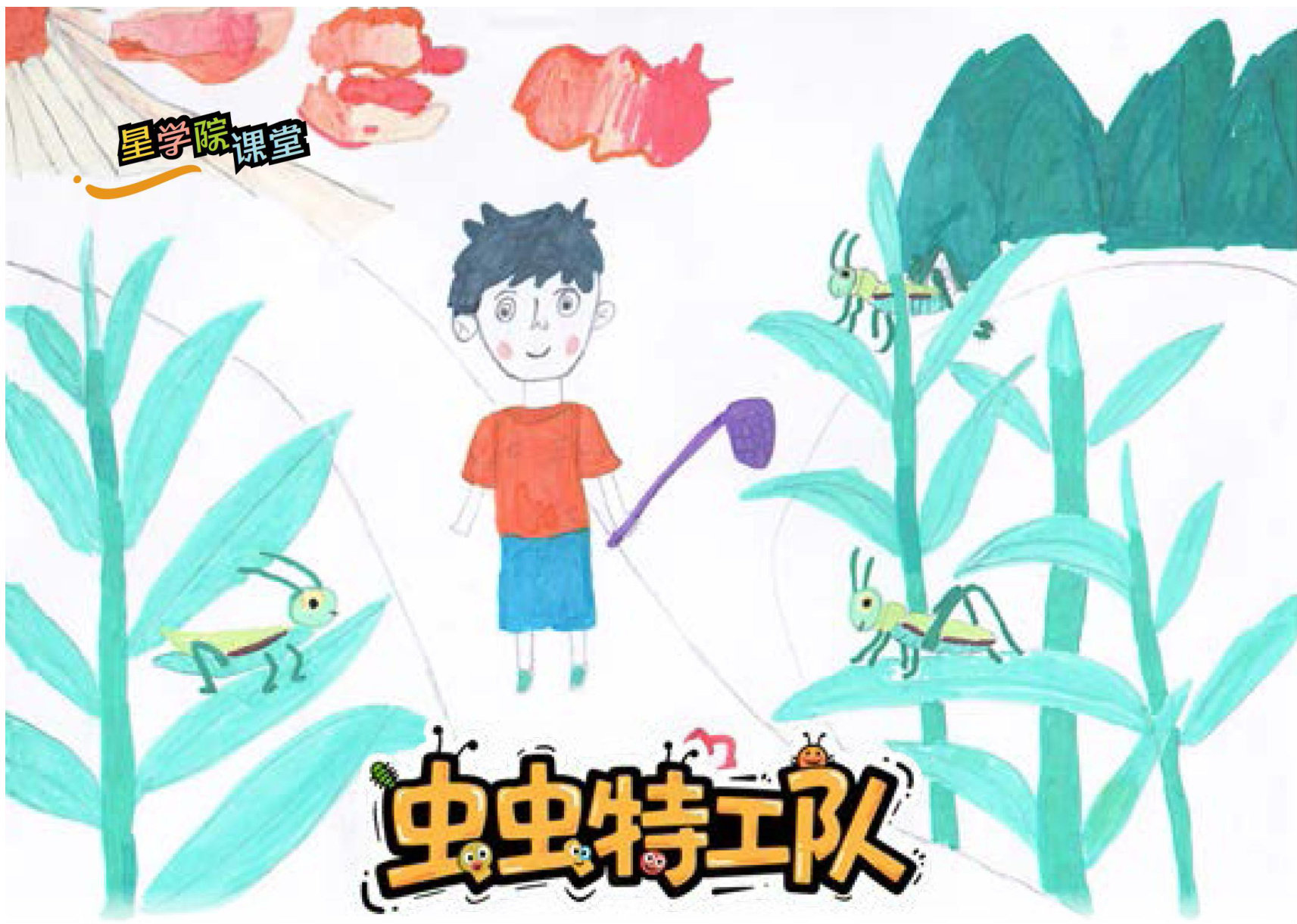 “呼啦啦—”网从稻田这边滑到那边,“呼啦啦—”网又从稻田那边滑到这边。“哇,妈妈快看,两只蚂蚱在网里面蹦来蹦去呢!”我大叫起来,手忙脚乱地把它们装进了蚂蚱的新游乐园一一瓶子里。它们有着棕色的眼睛,身体两侧长着黑棕色的条纹。