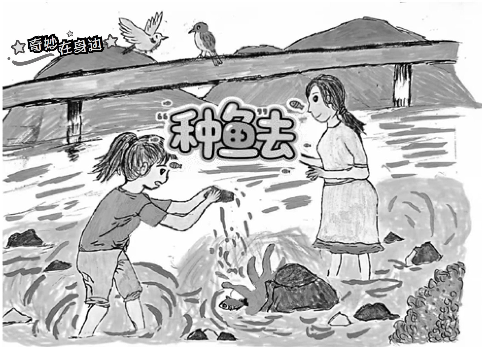 na tian gāng xia wan yu tianqitebié liangshuangma ma shén mide shuo zou 那天刚下完雨,天气特别凉爽。妈妈神秘地说:“走, daini men zhong yuqu wóhé xiao huo bān men dou zhang dàlezui d yu neng 带你们种鱼去!”我和小伙伴们都张大了嘴:“啊?鱼能 zhongma mani pian rénba 种?妈妈你骗人吧!”