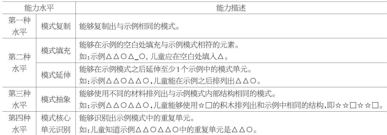 《3一6岁儿童学习与发展指南》指出,要引导幼儿“能发现事物简单的排列规律,并尝试创造新的排列规律”。在早期数学学习中整合模式的内容,有助于儿童对数学模型、数学概念的表征和抽象能力的发展。编制形成具有良好信效度的模式能力评估工具,是开展早期儿童模式能力研究的必要前提。(剩余6451字)