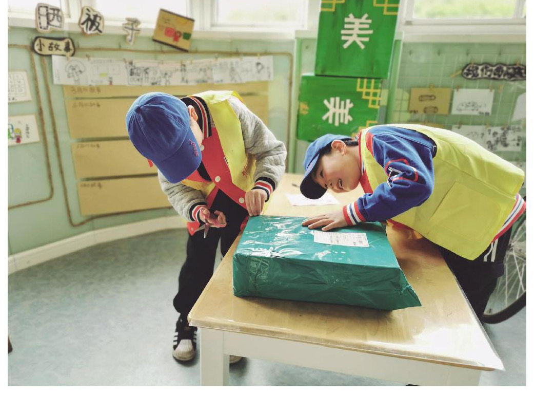 幼儿园里创设了“力力快递站”,每次游戏时,孩子们都会穿上黄背心、戴上蓝帽子,扮演快递员给大家送快递。这一次的“快递员”是大班的益益和宸宸。他们发现有个包裹虽然体积不大却很重,所以很想知道里面到底是什么。于是,他们拆开了包裹,发现里面装的是书,就把包裹重新包好,给曹老师送去了。