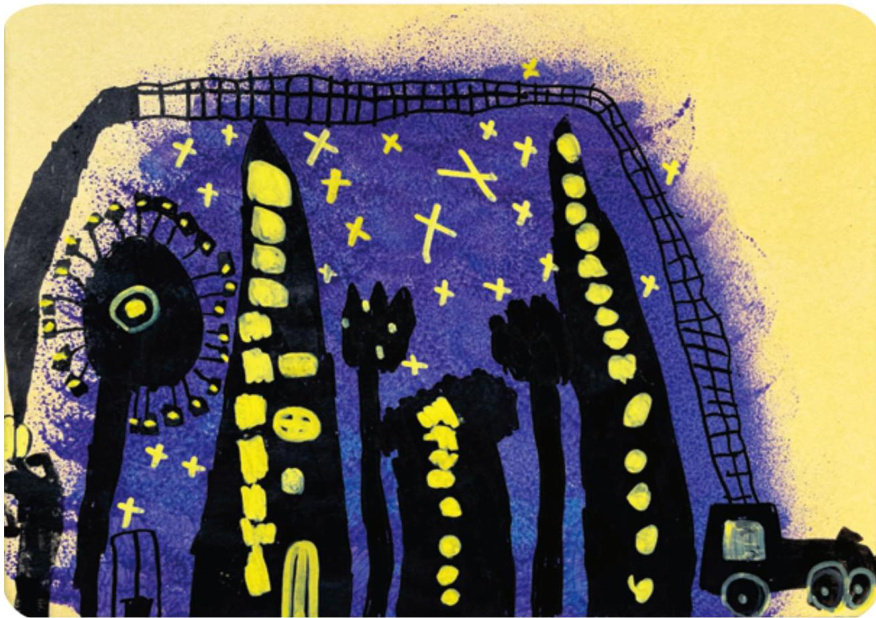 1.化身“城市探险家”,仔细阅读绘本,找出夜晚中城市的秘密,感受热闹的夜景氛围,激发创作兴趣。