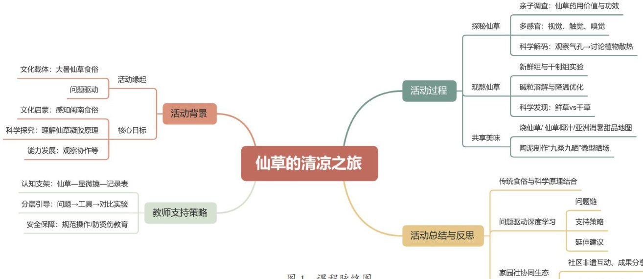 大暑是闽南地区“夏补”的重要节气,厦门同安作为闽南文化重镇,食用仙草这一食俗承载着独特的海洋文化与生态智慧。当幼儿了解到民谚有“六月大暑吃仙草,活如神仙不会老”的说法,十分好奇。“什么是仙草呢?”“为什么大暑节气要吃仙草?”“吃了仙草就不会热了吗?”“仙草是什么味道的呢?”于是我们开启了仙草的清凉之旅(课程脉络见图1)。(剩余3523字)