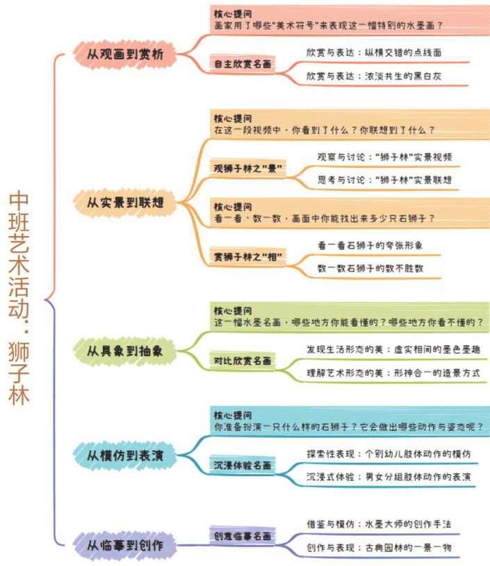 本次活动依托苏州本地独特的古典园林资源,引导幼儿将对园林的直观经验与名画鉴赏相链接,通过自主欣赏、视听共赏、对比欣赏、体验式欣赏等多种形式,帮助中班幼儿感知并体验“水墨园林、假山之最”的独特美感(活动设计导图见图1)。(剩余3196字)
