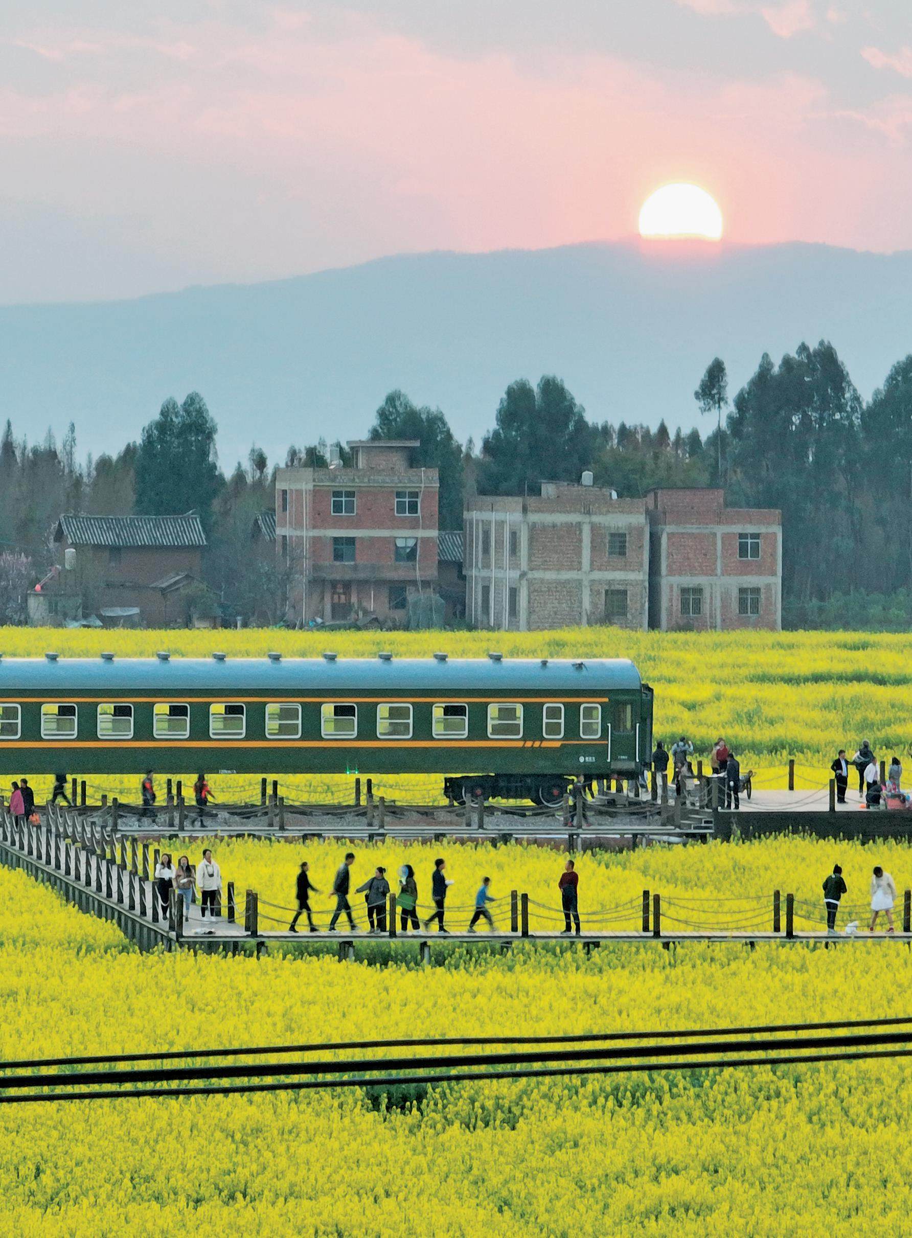 春风化雨引花开,从二月中旬以来,余家沟下村就因赏百亩油菜花而出圈,在蓝天白云的映衬下,在绿皮火车的装点下,在点点渔船的环绕下,百亩油菜花迎春绽放。一时间,游人纷至沓来,徜徉在金黄的花海,或赏花合影,或呼朋小聚,尽享美好春光。